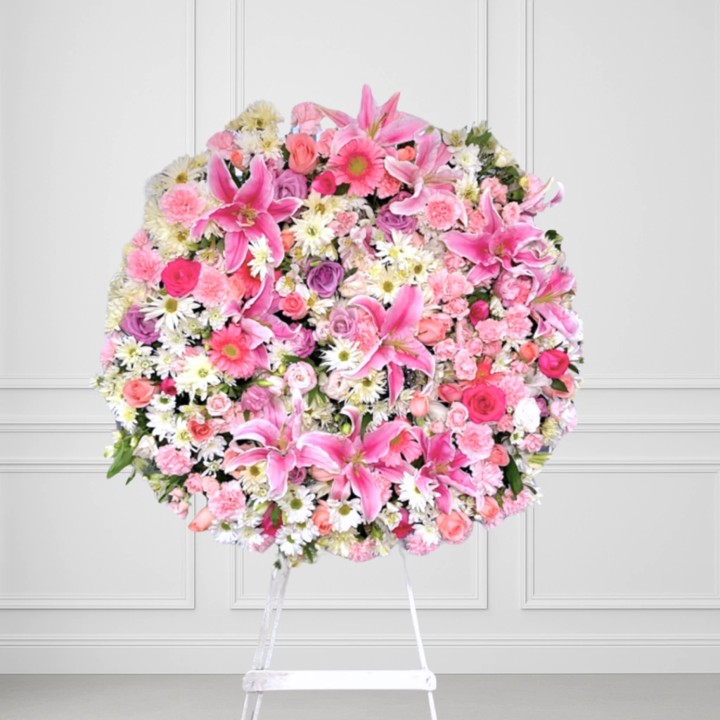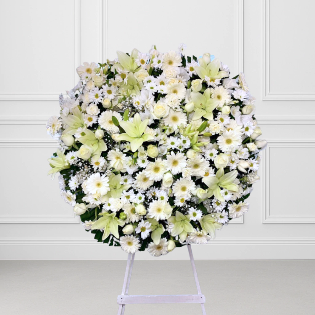 Un diseño solemne y elegante elaborado con una fina mezcla de flores blancas o rosas (segun eleccion) que representan paz, pureza y respeto. Ideal para expresar condolencias y acompañar en momentos difíciles con un mensaje de apoyo y esperanza.