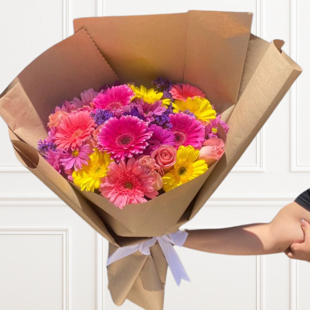 🌸 Contiene: 15 Gerberas Multicolor, 12 Rosas Color Hermosa, Margaritas Lilas y Espuma.