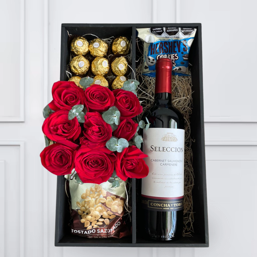 Un detalle sofisticado que combina la elegancia de las rosas con el sabor del vino y los mejores acompañamientos. Perfecto para sorprender en ocasiones especiales y transmitir cariño de manera única y memorable.