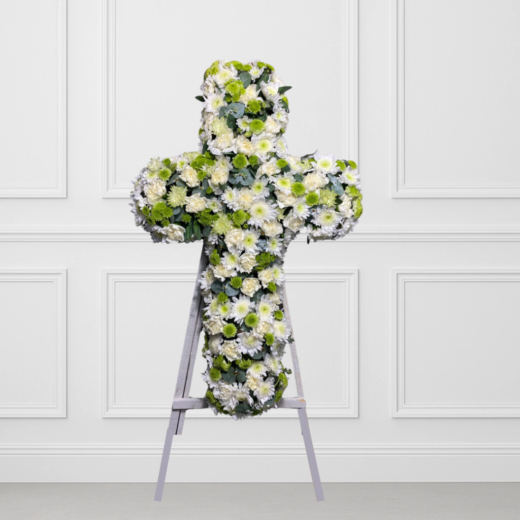 Un diseño solemne en forma de cruz elaborado con una mezcla de flores en tonos blancos y verdes. Representa fe, esperanza y consuelo, siendo un homenaje respetuoso y lleno de significado para despedir a un ser querido.
