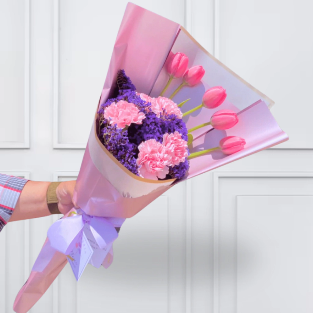 Un bouquet delicado y encantador que combina la elegancia de los tulipanes con la suavidad de los claveles. Perfecto para sorprender con un detalle sofisticado y lleno de ternura.
