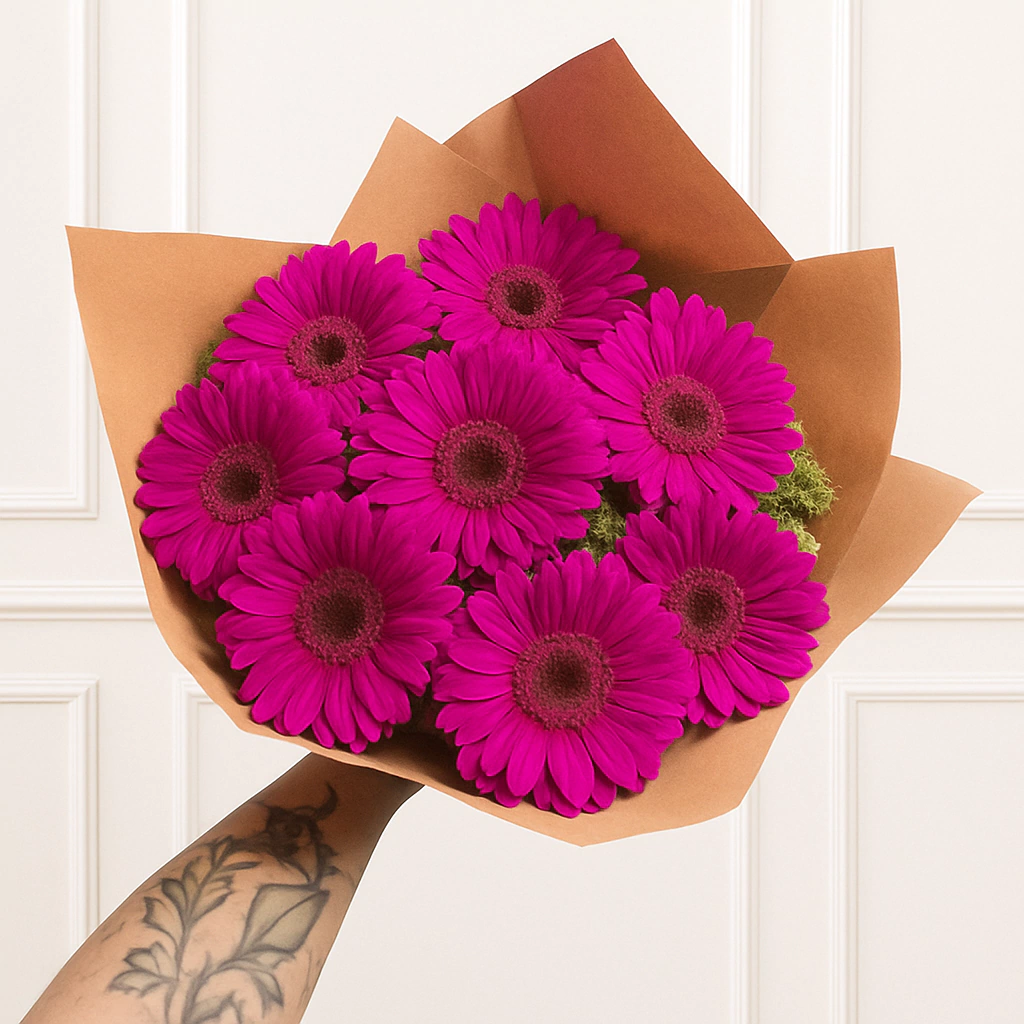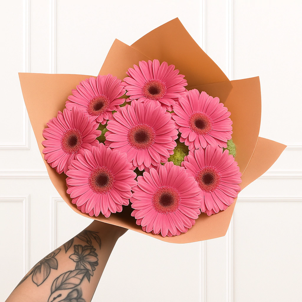 Un arreglo lleno de frescura y alegría, compuesto por hermosas gerberas rosas que transmiten ternura y vitalidad. Su diseño envuelto en papel kraft lo convierte en un detalle sencillo pero elegante, ideal para iluminar el día de alguien especial.