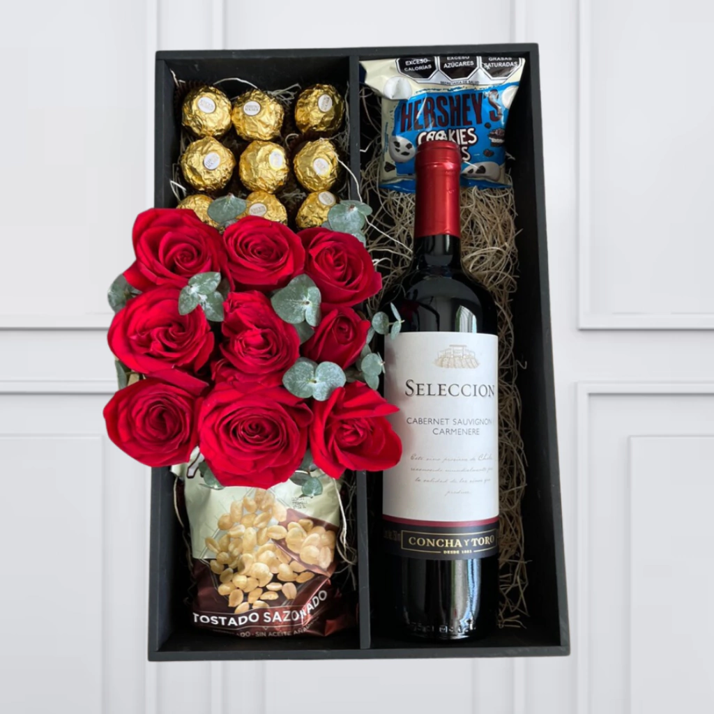 Un regalo elegante y completo que combina flores, vino y snacks premium. Perfecto para sorprender en cumpleaños, aniversarios o simplemente para consentir.